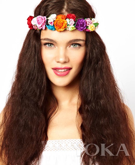 花环头饰花环头饰非常适合长发的妹纸,先将长发梳理通顺后散落在两肩,用秀发巧妙的挡住两颊宽宽的部位,最后再戴上颜色炫丽的花环头饰,仙女气质一下子就出来了。