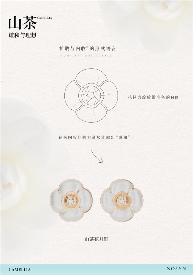 设计巧思:诺麟山茶花系列的设计灵感,源于山茶花“谦和与理想”的内在品格。它没有选择怒放的全开形态,而是聚焦于花苞待放或初绽的瞬间,通过“内敛与扩散”的对立统一来诠释力量。其花瓣采用三维立体锻造工艺,每一片花瓣的弧度和转折都经过精心计算,确保在任何侧光或顶光下,都能形成清晰、优雅的立体轮廓阴影,而非一片刺眼的光斑。花瓣中心镶嵌的精细锆石或温润贝母,如同晨露点缀,只在光线掠过时才会闪现一抹恰到好处的点睛之亮。