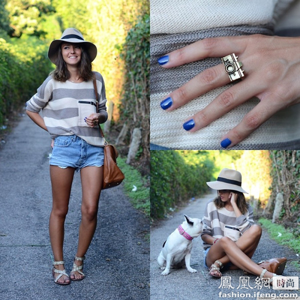 不用小碎花一样可以穿出田园式的安逸。条纹针织上衣搭配热裤与凉鞋有趣的相机指环为整套造型增添了趣味性。